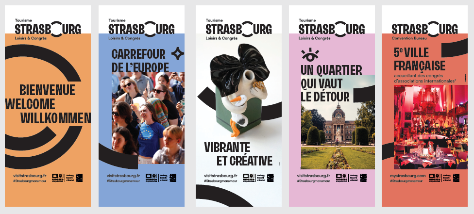 Cette nouvelle identité visuelle va à présent être déclinée sur les différents supports print et web de Strasbourg Tourisme Loisirs & Congrès : papeterie (courriers, cartes de visite, dossiers de presse, …), kakémonos, newsletter, réseaux sociaux, site web … Elle sera aussi affichée fièrement lors d’opérations de promotion comme les salons ou les workshops.